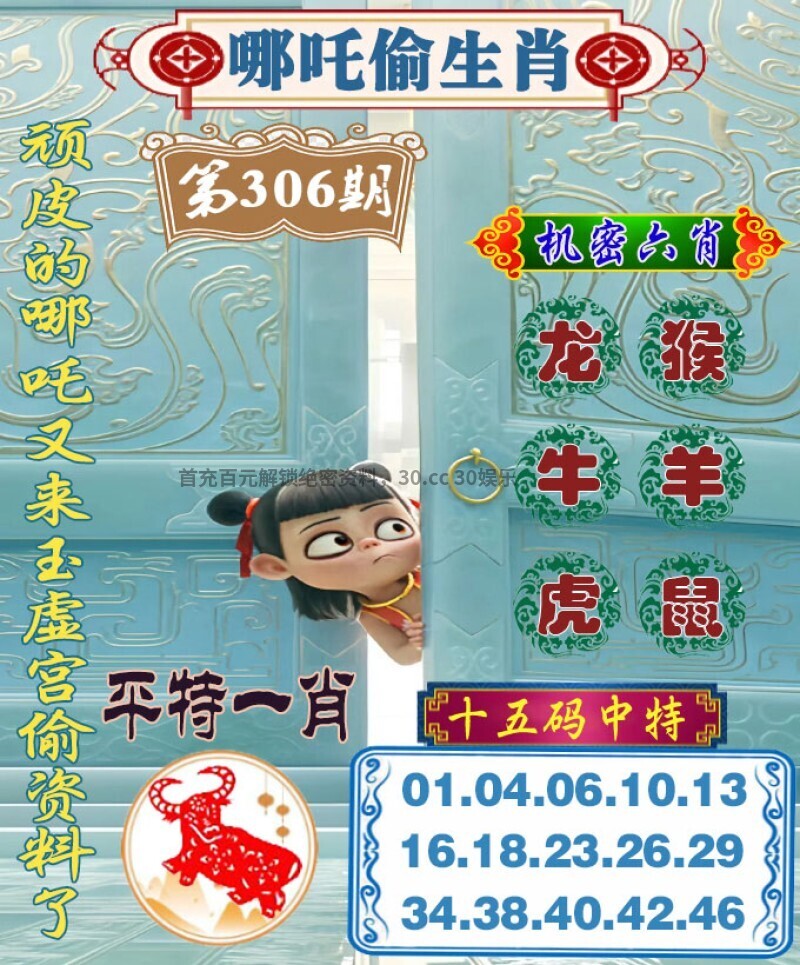 | 306期【解哪吒偷生肖】 解料:众生所归欢欢喜,今期生肖定南方 机密六肖:龙猴牛羊虎鼠 平特一肖:牛牛牛 |